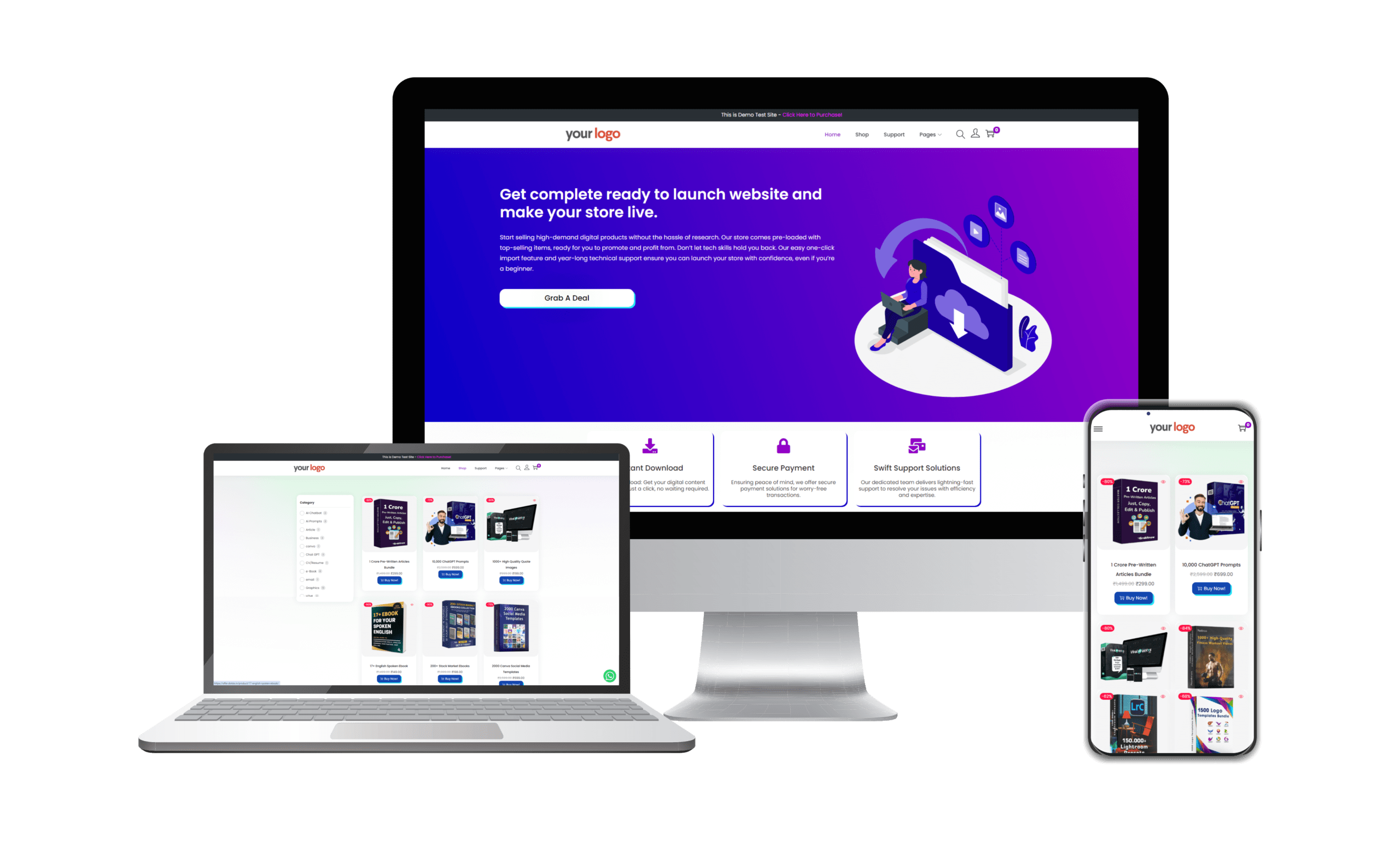 A digital download website is an online platform where users can purchase and download digital products, such as eBooks, software, music, and videos. Our website comes pre-loaded with high-demand digital products that you can sell and keep 100% of the profits.